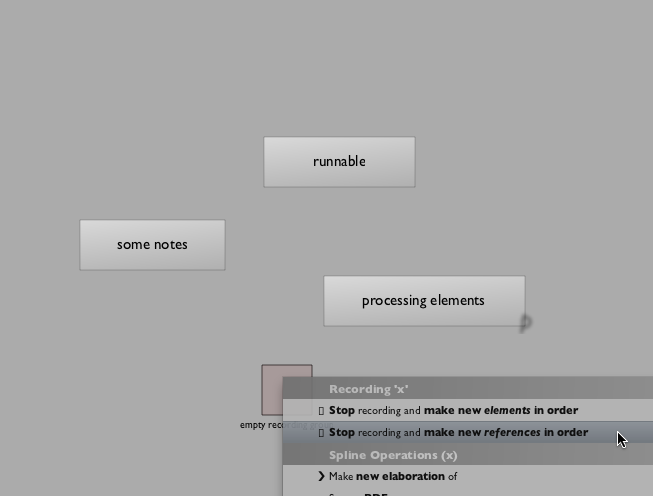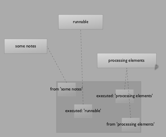 For the example here I have three elements. I've executed a line in "some notes" by hand (in the editor using command-return); I've option-clicked on "runnable" and I've both option-clicked "processing elements" and executed a piece of text in it.