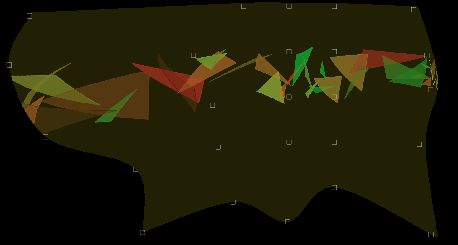 Inside that heavily distorted rectangle, there's a full 3d scene — camera, geometry, shaders, the works. It just happens to be being drawn not to a rectangular screen, but to a warped shape. This shape is defined by the control vertices (those squares) and you can click and drag those shapes around (or modify them in code) to define the warp.
