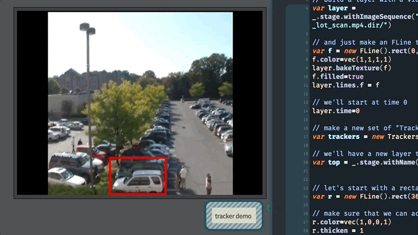var trackers = new Trackers(layer) — this takes a layer (which has a video texture associated with it) and builds a Trackers object for it. This object can be used to make tracks:var track = trackers.trackFLine(r) — this takes an FLine r and tracks it over time. This ‘track’ starts at layer.time and moves forward. This call might take a while the first time you call it for any particular FLine, subsequent calls will be quite fast.var rNow = track(layer.time) - for a particular time (here we just use layer.time) where is that shape now? This call returns a new FLine thats a copy of the original one passed to trackFLine but moved (and scaled) to be in the right spot. If the tracker has lost the shape it might return an empty FLine insteadOther than tracking FLines you can also ask for points to be tracked: var track = trackers.trackPoint(x, y, radius) lets you write point = track(layer.time) to get a new point on the canvas where that point has moved to. radius controls how large a neighborhood the tracker pays attention to — make this as large as possible (but no larger) for the best tracking.