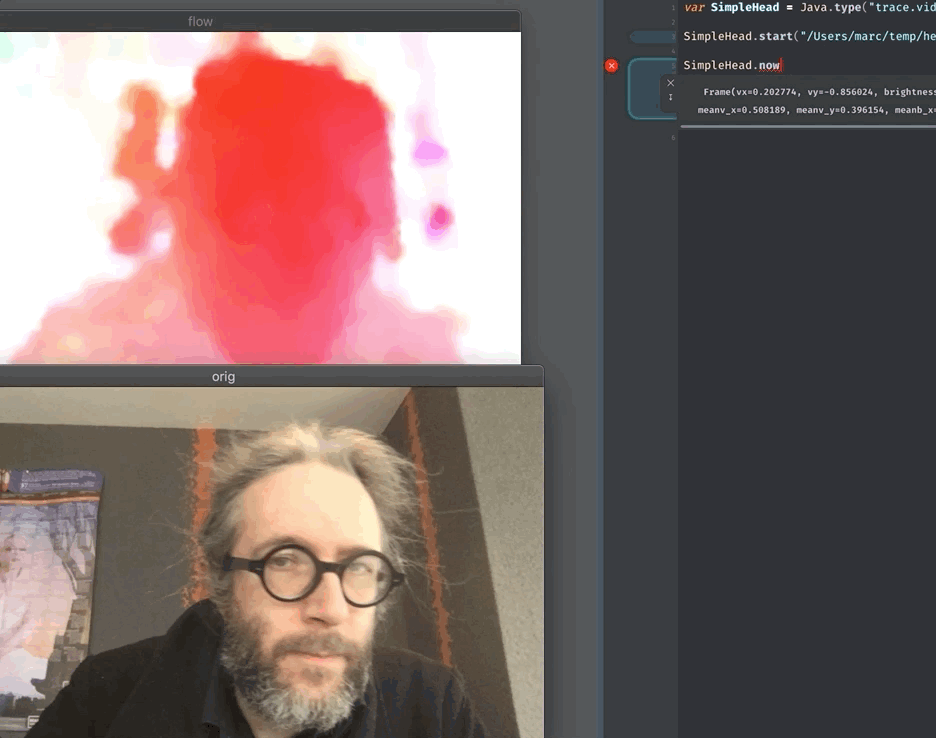 vx and vy — ‘velocities’. Average amounts of motion (in ‘pixels’) in the x and the y direction. This is correctly oriented for Field (positive vx is right, positive vy is down).brightness. Average brightness (note that almost all webcams auto expose, so this is only useful over the short-term).red, green, blue. Average red, green and blue.meanv_x and meanv_y are the ‘position’ of where the motion is occurring. That is, the average ‘x’ and ‘y’ position weighted by the amount of motion there. This only makes any sense at all if there’s a relatively compact object that’s doing most of the moving.meanb_x and meanb_y are the ‘position’ of where the brightness is occurring. That is, the average ‘x’ and ‘y’ position weighted by the amount of brightness there. This only makes any sense at all if there’s a relatively compact object that’s brighter than the background._.stage.withImageDirectory now looks for .simpleHead files in parallel with it. Given that you can ask a layer for a .head and get the same kind of object as SimpleHead.now returns for the frame (or mix of frames) that they layer is currently showing. For example, this code here, which combines some standard code for playing out a video on a Stage with some code that draws a line in the direction of motion: