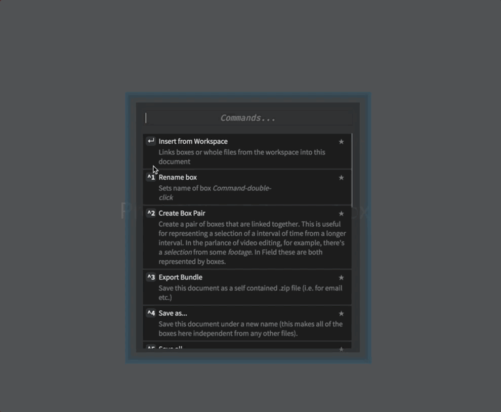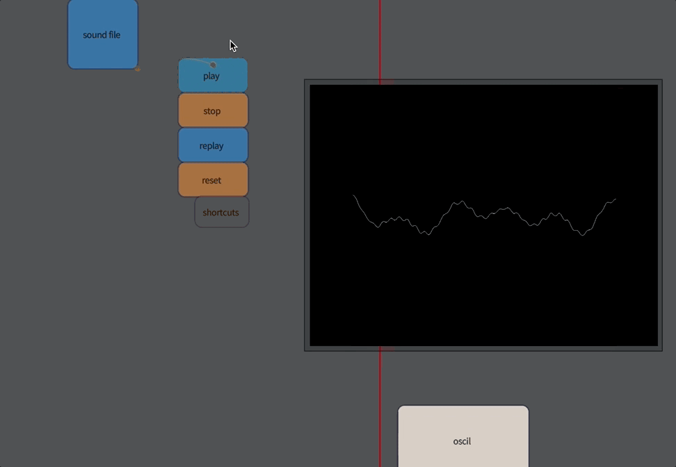 Crucially, we’ve now linked Field to an external clock — that means that Field’s red line will follow the audio playback hardware’s idea of what part of the sound is coming out of the speaker. This means that, for the first time, the horizontal position of a box has real absolute meaning. Field’s default is to say that there are 24 units of ‘x’ per second of time — that means that each ‘pixel’ (unless you zoom in) corresponds to a ‘frame’ at cinema speeds (24 frames a second). You can change this transformation inside ‘play’. You can also add a constant offset to tweak a delay between sound and image to compensate for any latency in the sound or display hardware that you have.