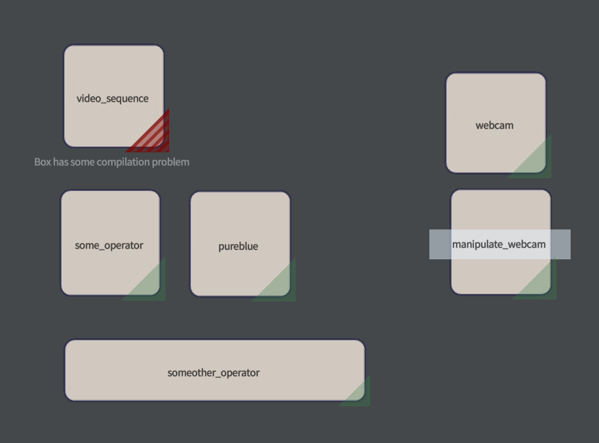 Furthermore, similar to modular synths, there’s no reason why you can’t tie yourself in a (productive) knot — one box’s code can use the output of a box that’s using the same box as an input. There will be one frame of delay as the signal goes round and around, so you won’t crash anything as you glory in some old-fashioned video feedback. The only thing a box’s code can’t do is refer to the box that it’s in. That doesn’t work on contemporary graphics hardware.