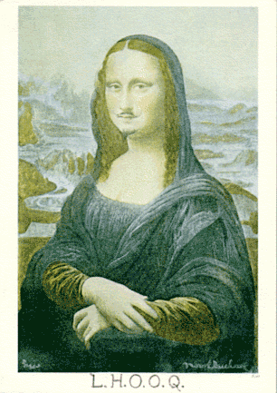 No need to look far. A well-known early example is Duchamp’s goateed Mona Lisa with its schoolboyish pun of a title (She has a hot ass). This piece sticks in your mind for the same reason that an advertisement does — both have the same form: they’re designed to be taken in at a glance, but with a double-take at the slight transgression.